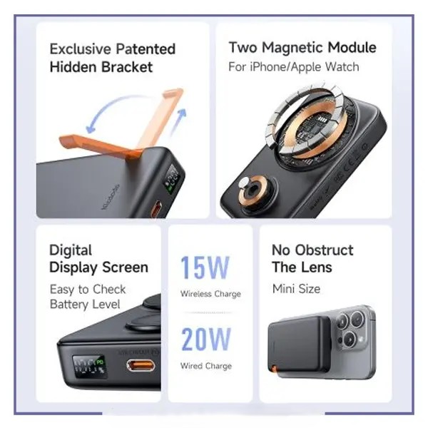 طراحی با استند داخلی این پاوربانک به شما این امکان را میدهد که گوشی خود را بهطور عمودی روی پاوربانک قرار دهید و از آن به عنوان یک استند برای تماشای ویدئوها یا مکالمات ویدیویی استفاده کنید. این ویژگی علاوه بر کارایی، راحتی را نیز به ارمغان میآورد.